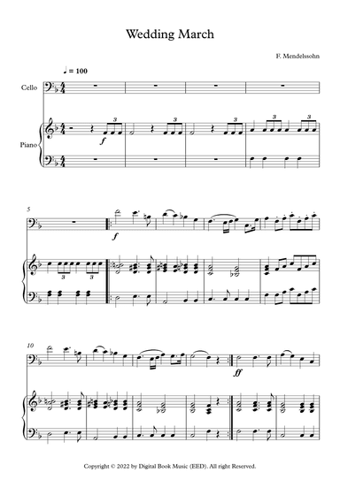 Cello,Piano - Level 1 - Digital Download SKU: A0.1240516 Composed by Felix Bartholdy Mendelssohn. Arranged by Digital Book Music. Classical. Score and part. 2 pages. Digital Book Music #835899. Published by Digital Book Music (A0.1240516). Wedding March - Felix Bartholdy Mendelssohn (Cello + Piano). This product was created by a member of ArrangeMe, Hal Leonard’s global self-publishing community of independent composers, arrangers, and songwriters. ArrangeMe allows for the publication of unique arrangements of both popular titles and original compositions from a wide variety of voices and backgrounds. About Digital Downloads Digital Downloads are downloadable sheet music files that can be viewed directly on your computer, tablet or mobile device. Once you download your digital sheet music, you can view and print it at home, school, or anywhere you want to make music, and you don’t have to be connected to the internet. Just purchase, download and play! PLEASE NOTE: Your Digital Download will have a watermark at the bottom of each page that will include your name, purchase date and number of copies purchased. You are only authorized to print the number of copies that you have purchased. You may not digitally distribute or print more copies than purchased for use (i.e., you may not print or digitally distribute individual copies to friends or students).