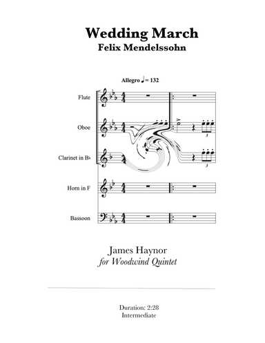 Woodwind Ensemble,Woodwind Quintet - Level 1 - Digital Download SKU: A0.1183451 Composed by Felix Bartholdy Mendelssohn. Arranged by Langanho. Classical,March,Opera,Romantic Period,Wedding. 7 pages. Avery Lynn Jordan #783117. Published by Avery Lynn Jordan (A0.1183451). This is a reduction for woodwind quintet, with the intention of giving better practicity to groups that intend to play at weddings, and not only that, it can be used in several occasions, both by professionals and beginners, because it was adapted to be easy to perform. The Wedding March by Felix Mendelssohn was composed in 1842 to set the music for the play A Midsummer Night's Dream (Musik zu Ein Sommernachtstraum). It is a piece of music played during wedding ceremonies, at the moment of the bride's entrance, usually preceded by notes of Triumphal Clarins that emphasize the importance of this moment. Originally the piece is instrumental, having been performed at weddings in the version. This product was created by a member of ArrangeMe, Hal Leonard’s global self-publishing community of independent composers, arrangers, and songwriters. ArrangeMe allows for the publication of unique arrangements of both popular titles and original compositions from a wide variety of voices and backgrounds. About Digital Downloads Digital Downloads are downloadable sheet music files that can be viewed directly on your computer, tablet or mobile device. Once you download your digital sheet music, you can view and print it at home, school, or anywhere you want to make music, and you don’t have to be connected to the internet. Just purchase, download and play! PLEASE NOTE: Your Digital Download will have a watermark at the bottom of each page that will include your name, purchase date and number of copies purchased. You are only authorized to print the number of copies that you have purchased. You may not digitally distribute or print more copies than purchased for use (i.e., you may not print or digitally distribute individual copies to friends or students).