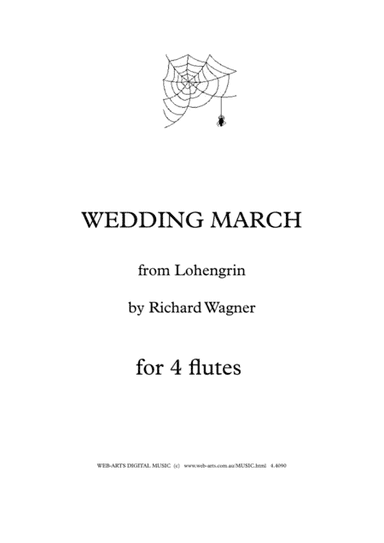 Flute Solo - Level 3 - Digital Download SKU: A0.721494 Composed by Wagner, Robert. Arranged by Music-Scores.com. Wedding. Individual part. 7 pages. Music-Scores.com #4642685. Published by Music-Scores.com (A0.721494). Wedding March, Bridal Chorus, Here Comes the Bride: this famous piece from the opera Lohengrin, is known by all those titles.Duration: about 1 minute, 30 seconds.For 4 Flutes.Arranged by Anne L Christopherson GRSM ARCM at www.music-scores.com This product was created by a member of ArrangeMe, Hal Leonard’s global self-publishing community of independent composers, arrangers, and songwriters. ArrangeMe allows for the publication of unique arrangements of both popular titles and original compositions from a wide variety of voices and backgrounds. About Digital Downloads Digital Downloads are downloadable sheet music files that can be viewed directly on your computer, tablet or mobile device. Once you download your digital sheet music, you can view and print it at home, school, or anywhere you want to make music, and you don’t have to be connected to the internet. Just purchase, download and play! PLEASE NOTE: Your Digital Download will have a watermark at the bottom of each page that will include your name, purchase date and number of copies purchased. You are only authorized to print the number of copies that you have purchased. You may not digitally distribute or print more copies than purchased for use (i.e., you may not print or digitally distribute individual copies to friends or students).