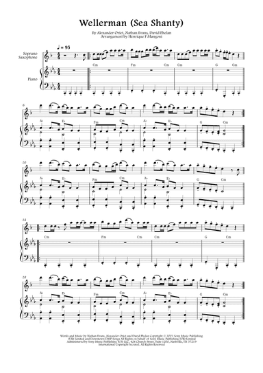 Piano,Tenor Saxophone - Level 1 - Digital Download SKU: A0.1103357 By Nathan Evans. By Alexander Oriet, David Phelan, and Nathan Evans. Arranged by Henrique F Mangoni. Children,Folk. Score and part. 3 pages. Henrique Franke Mangoni #706620. Published by Henrique Franke Mangoni (A0.1103357). Wellerman (Sea Shanty) by Nathan Evans. tenor sax and piano accompaniment easy/beginner arrangement. Perfect for students, children, beginners, music teachers and tenor sax teachers. Learn to play the TikTok viral song Wellerman (Sea Shanty) on the tenor sax! This edition includes the chords of the song. Subscribe to my YouTube channel to know more about my work! wellerman (sea shanty) tenor sax sheet music, wellerman tenor sax sheet music, wellerman (sea shanty) easy tenor sax sheet music, wellerman easy tenor sax sheet music, wellerman tenor sax, wellerman easy tenor sax, wellerman (sea shanty) piano sheet music, wellerman piano sheet music, wellerman (sea shanty) easy piano sheet music, wellerman easy piano sheet music, wellerman piano chords, wellerman easy piano chords, wellerman piano, wellerman easy piano, wellerman by nathan evans. This product was created by a member of ArrangeMe, Hal Leonard’s global self-publishing community of independent composers, arrangers, and songwriters. ArrangeMe allows for the publication of unique arrangements of both popular titles and original compositions from a wide variety of voices and backgrounds. About Digital Downloads Digital Downloads are downloadable sheet music files that can be viewed directly on your computer, tablet or mobile device. Once you download your digital sheet music, you can view and print it at home, school, or anywhere you want to make music, and you don’t have to be connected to the internet. Just purchase, download and play! PLEASE NOTE: Your Digital Download will have a watermark at the bottom of each page that will include your name, purchase date and number of copies purchased. You are only authorized to print the number of copies that you have purchased. You may not digitally distribute or print more copies than purchased for use (i.e., you may not print or digitally distribute individual copies to friends or students).