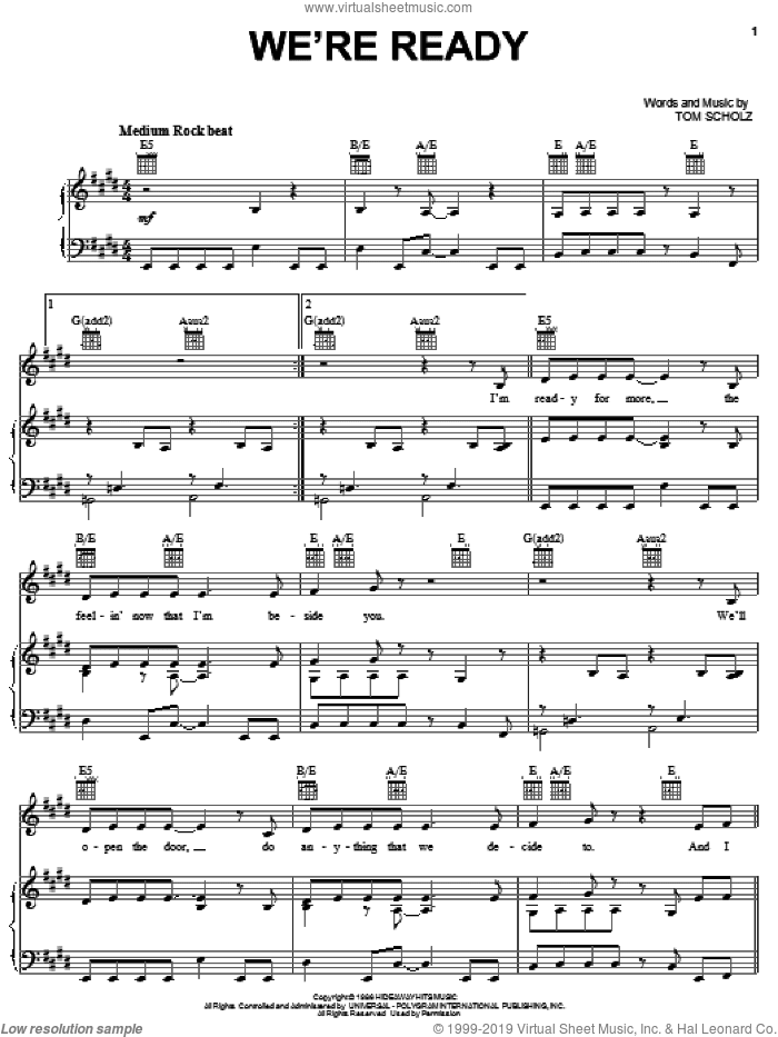 Digital sheet music for voice, piano or guitarNOTE: chords, lead sheet indications and lyrics may be included (please, check the first page above before to buy this item to see what's included)Publisher: Hal LeonardContributors to this music title:Tom Scholz (writer)This item includes: PDF (digital sheet music to download and print), Interactive Sheet Music (for online playback, transposition and printing). You can transpose this music in any key.Instrumentation:voice, piano or guitarSkill Level:intermediateGenre:pop, rockPages:8