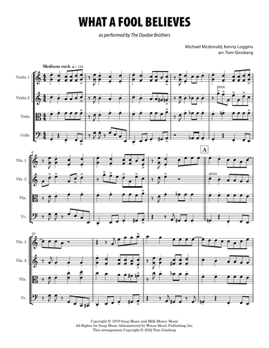 String Ensemble Cello,Viola,Violin - Level 4 - Digital Download SKU: A0.1259205 By The Doobie Brothers. By Kenny Loggins and Michael McDonald. Arranged by Gary Wolk. 20th Century,Pop,Rock. 30 pages. Gary Wolk Music #852477. Published by Gary Wolk Music (A0.1259205). An instrumental version of The Doobie Brothers song written for a 7-piece string ensemble. This product was created by a member of ArrangeMe, Hal Leonard’s global self-publishing community of independent composers, arrangers, and songwriters. ArrangeMe allows for the publication of unique arrangements of both popular titles and original compositions from a wide variety of voices and backgrounds. About Digital Downloads Digital Downloads are downloadable sheet music files that can be viewed directly on your computer, tablet or mobile device. Once you download your digital sheet music, you can view and print it at home, school, or anywhere you want to make music, and you don’t have to be connected to the internet. Just purchase, download and play! PLEASE NOTE: Your Digital Download will have a watermark at the bottom of each page that will include your name, purchase date and number of copies purchased. You are only authorized to print the number of copies that you have purchased. You may not digitally distribute or print more copies than purchased for use (i.e., you may not print or digitally distribute individual copies to friends or students).