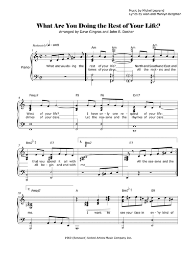 Jazz Ensemble Jazz Ensemble - Level 4 - Digital Download SKU: A0.1008461 Composed by Michel Legrand. Arranged by Kirk Schmidt. Contemporary. Score and parts. 19 pages. Kirk Schmidt #4821621. Published by Kirk Schmidt (A0.1008461). A lovely ballad with a Tenor Sax I ad lib solo. To listen to the entire arrangement of this beautiful song written by Michel Legrand, please go to SoundCloud and follow this link to my Page: https://soundcloud.com/kirk-147712419/what-are-you-doing-the-rest-of-your-life?si=a720363cadaf413e964d72daca92ebb0&utm_source=clipboard&utm_medium=text&utm_campaign=social_sharing. This product was created by a member of ArrangeMe, Hal Leonard’s global self-publishing community of independent composers, arrangers, and songwriters. ArrangeMe allows for the publication of unique arrangements of both popular titles and original compositions from a wide variety of voices and backgrounds. About Digital Downloads Digital Downloads are downloadable sheet music files that can be viewed directly on your computer, tablet or mobile device. Once you download your digital sheet music, you can view and print it at home, school, or anywhere you want to make music, and you don’t have to be connected to the internet. Just purchase, download and play! PLEASE NOTE: Your Digital Download will have a watermark at the bottom of each page that will include your name, purchase date and number of copies purchased. You are only authorized to print the number of copies that you have purchased. You may not digitally distribute or print more copies than purchased for use (i.e., you may not print or digitally distribute individual copies to friends or students).