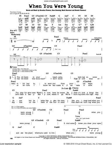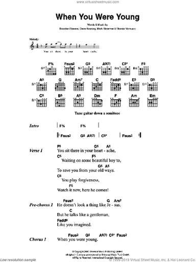 Digital sheet music for voice, piano or guitar, version 2NOTE: chords, lead sheet indications and lyrics may be included (please, check the first page above before to buy this item to see what's included)Publisher: Hal LeonardContributors to this music title:Brandon Flowers (writer)Dave Keuning (writer)Mark Stoermer (writer)Ronnie Vannucci (writer)This item includes: PDF (digital sheet music to download and print), Interactive Sheet Music (for online playback, transposition and printing). You can transpose this music in any key.Instrumentation:voice, piano or guitarSkill Level:intermediateGenre:pop, rockPages:7
