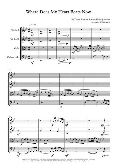 String Quartet Cello,String Quartet,Viola,Violin - Level 3 - Digital Download SKU: A0.1074692 By Celine Dion. By Robert White Johnson and Taylor Rhodes. Arranged by Marti Carrasco. Pop. Score and parts. 15 pages. Candlelight #678962. Published by Candlelight (A0.1074692). This product was created by a member of ArrangeMe, Hal Leonard's global self-publishing community of independent composers, arrangers, and songwriters. ArrangeMe allows for the publication of unique arrangements of popular titles and original compositions from a variety of voices and backgrounds. The length, difficulty, and retail pricing are determined solely by the discretion of the person who arranged or composed it. About Digital Downloads Digital Downloads are downloadable sheet music files that can be viewed directly on your computer, tablet or mobile device. Once you download your digital sheet music, you can view and print it at home, school, or anywhere you want to make music, and you don’t have to be connected to the internet. Just purchase, download and play! PLEASE NOTE: Your Digital Download will have a watermark at the bottom of each page that will include your name, purchase date and number of copies purchased. You are only authorized to print the number of copies that you have purchased. You may not digitally distribute or print more copies than purchased for use (i.e., you may not print or digitally distribute individual copies to friends or students).