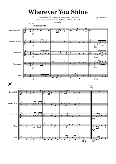 Brass Ensemble - Level 3 - Digital Download SKU: A0.955711 Composed by BlechMax. Christmas,Easter,Graduation. Score and parts. 9 pages. Markus Dag #6346407. Published by Markus Dag (A0.955711). Wherever You Shine for Brass Quintet. This product was created by a member of ArrangeMe, Hal Leonard’s global self-publishing community of independent composers, arrangers, and songwriters. ArrangeMe allows for the publication of unique arrangements of both popular titles and original compositions from a wide variety of voices and backgrounds. About Digital Downloads Digital Downloads are downloadable sheet music files that can be viewed directly on your computer, tablet or mobile device. Once you download your digital sheet music, you can view and print it at home, school, or anywhere you want to make music, and you don’t have to be connected to the internet. Just purchase, download and play! PLEASE NOTE: Your Digital Download will have a watermark at the bottom of each page that will include your name, purchase date and number of copies purchased. You are only authorized to print the number of copies that you have purchased. You may not digitally distribute or print more copies than purchased for use (i.e., you may not print or digitally distribute individual copies to friends or students).