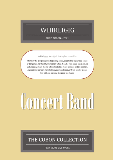 Concert Band - Level 3 - Digital Download SKU: A0.1001781 Composed by Chris Cobon. Contemporary. Score and parts. 75 pages. Chris Cobon #6319843. Published by Chris Cobon (A0.1001781). Whirligig, an object that spins or whirls. Think of the old playground spinning seats, dream-like but with a sense of danger and a thankful reflection when it ends! This piece has a simple yet pleasing main theme which leads to a more sinister middle section. A great mid-concert item letting your band recover from louder pieces but without slowing the pace too much. Duration 32:59Appropriate for Community groups, advanced schools groups. For live or virtual performance.· INSTRUMENTATION: (* = part shown in score) · Flute (often doubled at the octave)* · Oboe* · Bassoon* · Clarinet 1and 2* · Eb Alto Clarinet (covers bass line) · Bass Clarinet (covers bass line)* · Eb Alto Saxophone 1, 2* · Bb Tenor Saxophone* · Eb Baritone Saxophone (covers bass line)* · Trumpet in Bb 1, 2* · Horn in F* · Eb Horn · Trombone 1, 2, 3 in Bb Treble clef (3 is treble version of Bass Trombone) · Trombone 1, 2 (Bass Clef)* · Bass Trombone (Bass Clef)* · Bb Euphonium Treble clef (also for Baritones) · Euphonium Bass clef* · Tuba (concert pitch Bass clef)* · String Bass · Eb Bass Treble clef · Bb Bass Treble clef · Percussion: · Clash and Suspended Cymbals* · Glockenspiel* · Timpani* · Kit*   This product was created by a member of ArrangeMe, Hal Leonard’s global self-publishing community of independent composers, arrangers, and songwriters. ArrangeMe allows for the publication of unique arrangements of both popular titles and original compositions from a wide variety of voices and backgrounds. About Digital Downloads Digital Downloads are downloadable sheet music files that can be viewed directly on your computer, tablet or mobile device. Once you download your digital sheet music, you can view and print it at home, school, or anywhere you want to make music, and you don’t have to be connected to the internet. Just purchase, download and play! PLEASE NOTE: Your Digital Download will have a watermark at the bottom of each page that will include your name, purchase date and number of copies purchased. You are only authorized to print the number of copies that you have purchased. You may not digitally distribute or print more copies than purchased for use (i.e., you may not print or digitally distribute individual copies to friends or students).