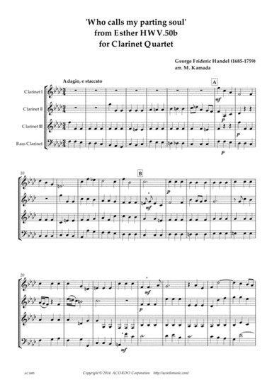 Clarinet Solo - Level 3 - Digital Download SKU: A0.777979 Composed by George Frideric Handel. Arranged by Mikio Kamada. Baroque. Individual part. 6 pages. ACORDO Sheet Music #4730135. Published by ACORDO Sheet Music (A0.777979). Esther, HWV.50b is an oratorio composed by George Frideric Handel. The story is set in 4th century B.C. of Persia. "Who calls my parting soul" is a beautiful area duet for Esther and King Ahaseurus. The music was originally written as "Soll mein kind" in Brockes Passion, HWV.48. The lower melody part was a little bit decorated in Esther. This product was created by a member of ArrangeMe, Hal Leonard’s global self-publishing community of independent composers, arrangers, and songwriters. ArrangeMe allows for the publication of unique arrangements of both popular titles and original compositions from a wide variety of voices and backgrounds. About Digital Downloads Digital Downloads are downloadable sheet music files that can be viewed directly on your computer, tablet or mobile device. Once you download your digital sheet music, you can view and print it at home, school, or anywhere you want to make music, and you don’t have to be connected to the internet. Just purchase, download and play! PLEASE NOTE: Your Digital Download will have a watermark at the bottom of each page that will include your name, purchase date and number of copies purchased. You are only authorized to print the number of copies that you have purchased. You may not digitally distribute or print more copies than purchased for use (i.e., you may not print or digitally distribute individual copies to friends or students).