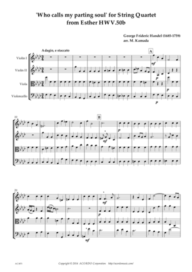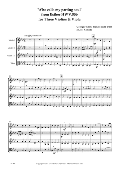 Instrumental Duet Instrumental Duet,Viola,Violin - Level 3 - Digital Download SKU: A0.777978 Composed by George Frideric Handel. Arranged by Mikio Kamada. Baroque. Score and parts. 6 pages. ACORDO Sheet Music #4730127. Published by ACORDO Sheet Music (A0.777978). Esther, HWV.50b is an oratorio composed by George Frideric Handel. The story is set in 4th century B.C. of Persia. "Who calls my parting soul" is a beautiful area duet for Esther and King Ahaseurus. The music was originally written as "Soll mein kind" in Brockes Passion, HWV.48. The lower melody part was a little bit decorated in Esther. This product was created by a member of ArrangeMe, Hal Leonard’s global self-publishing community of independent composers, arrangers, and songwriters. ArrangeMe allows for the publication of unique arrangements of both popular titles and original compositions from a wide variety of voices and backgrounds. About Digital Downloads Digital Downloads are downloadable sheet music files that can be viewed directly on your computer, tablet or mobile device. Once you download your digital sheet music, you can view and print it at home, school, or anywhere you want to make music, and you don’t have to be connected to the internet. Just purchase, download and play! PLEASE NOTE: Your Digital Download will have a watermark at the bottom of each page that will include your name, purchase date and number of copies purchased. You are only authorized to print the number of copies that you have purchased. You may not digitally distribute or print more copies than purchased for use (i.e., you may not print or digitally distribute individual copies to friends or students).