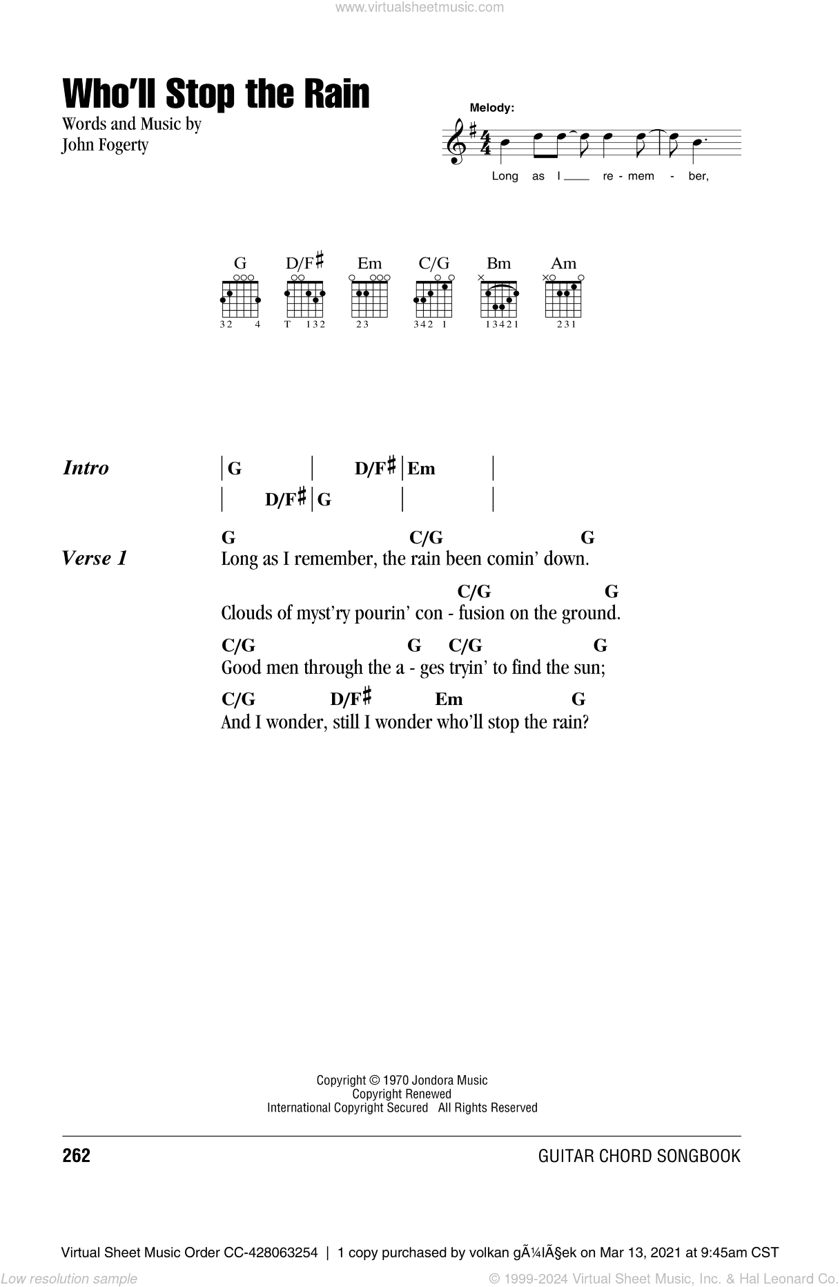 Digital sheet music for guitar (chords), version 3NOTE: guitar chords only, lyrics and melody may be included (please, check the first page above before to buy this item to see what's included)Publisher: Hal LeonardContributors to this music title:John Fogerty (writer)This item includes: PDF (digital sheet music to download and print)Instrumentation:guitar (chords)Skill Level:intermediateGenre:pop, rockPages:2