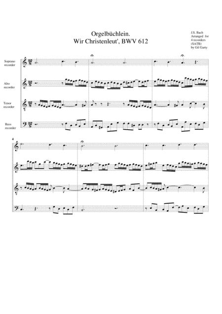 Wir Christenleut', BWV 612 from Orgelbuechlein (arrangement for 4 recorders) (arr. Gil Garty)