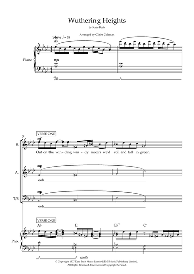 Piano,Vocal,Voice - Level 4 - Digital Download SKU: A0.510705 Composed by Kate Bush. Arranged by Mario Stallbaumer. Contemporary. Score. 7 pages. Mario Stallbaumer #5710097. Published by Mario Stallbaumer (A0.510705). Here's how to play "Wuthering Heights" by Kate Bush on piano!With this sheet music, you get an accurate piano arrangement of the full song which is playable, and sounds fantastic!The full melody is included in the piano part, so it makes for a wonderful instrumental (piano solo) version. However, you can also use this piano sheet music to accompany a singer, or sing along yourself - it comes with a system for the singer, as well as the song's full lyrics!"Wuthering Heights" was released in 1977 as Kate Bush's debut single, and served as the lead single from her 1978 debut album "The Kick Inside". The song topped the UK Singles Chart for 4 weeks, making Kate Bush the first woman to top the British charts with a self-written song!Based on Emily Brontë's 1847 novel "Wuthering Heights", the song has an original sound, and quite interesting harmonic changes. It also makes for a wonderful piano cover!If you like this arrangement, please consider leaving a review - it would mean a lot. This product was created by a member of ArrangeMe, Hal Leonard's global self-publishing community of independent composers, arrangers, and songwriters. ArrangeMe allows for the publication of unique arrangements of popular titles and original compositions from a variety of voices and backgrounds. The length, difficulty, and retail pricing are determined solely by the discretion of the person who arranged or composed it. About Digital Downloads Digital Downloads are downloadable sheet music files that can be viewed directly on your computer, tablet or mobile device. Once you download your digital sheet music, you can view and print it at home, school, or anywhere you want to make music, and you don’t have to be connected to the internet. Just purchase, download and play! PLEASE NOTE: Your Digital Download will have a watermark at the bottom of each page that will include your name, purchase date and number of copies purchased. You are only authorized to print the number of copies that you have purchased. You may not digitally distribute or print more copies than purchased for use (i.e., you may not print or digitally distribute individual copies to friends or students).