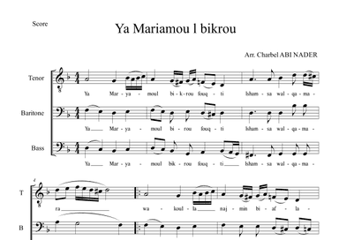 Choral Choir (3-Part) - Level 3 - Digital Download SKU: A0.1094713 By Toufic Hatem. By Maronite Tradition. Arranged by Charbel ABI NADER. A Cappella,Praise & Worship,Sacred. Octavo. 1 pages. Charbel Abi Nader #698786. Published by Charbel Abi Nader (A0.1094713). I took the melody of "Ya Maryamou l Bikrou fouqti" and wrote it for TBB. This product was created by a member of ArrangeMe, Hal Leonard’s global self-publishing community of independent composers, arrangers, and songwriters. ArrangeMe allows for the publication of unique arrangements of both popular titles and original compositions from a wide variety of voices and backgrounds. About Digital Downloads Digital Downloads are downloadable sheet music files that can be viewed directly on your computer, tablet or mobile device. Once you download your digital sheet music, you can view and print it at home, school, or anywhere you want to make music, and you don’t have to be connected to the internet. Just purchase, download and play! PLEASE NOTE: Your Digital Download will have a watermark at the bottom of each page that will include your name, purchase date and number of copies purchased. You are only authorized to print the number of copies that you have purchased. You may not digitally distribute or print more copies than purchased for use (i.e., you may not print or digitally distribute individual copies to friends or students).