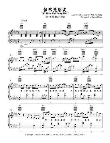 Piano,Vocal,Voice - Level 2 - Digital Download SKU: A0.781892 By Heng Yu. By Guo Lun Huang. Arranged by Javin Tham. Contemporary. Score. 5 pages. Javin Tham #6019623. Published by Javin Tham (A0.781892). 依然是朋友 "Yi Ran Shi Peng You" (Still Friends) by 宇珩 Yu HengArranged in the original key of A♭ major at the tempo of 60 bpm.Piano solo arrangement includes the lyrical melody and instrumental solo parts from the original music. This product was created by a member of ArrangeMe, Hal Leonard’s global self-publishing community of independent composers, arrangers, and songwriters. ArrangeMe allows for the publication of unique arrangements of both popular titles and original compositions from a wide variety of voices and backgrounds. About Digital Downloads Digital Downloads are downloadable sheet music files that can be viewed directly on your computer, tablet or mobile device. Once you download your digital sheet music, you can view and print it at home, school, or anywhere you want to make music, and you don’t have to be connected to the internet. Just purchase, download and play! PLEASE NOTE: Your Digital Download will have a watermark at the bottom of each page that will include your name, purchase date and number of copies purchased. You are only authorized to print the number of copies that you have purchased. You may not digitally distribute or print more copies than purchased for use (i.e., you may not print or digitally distribute individual copies to friends or students).