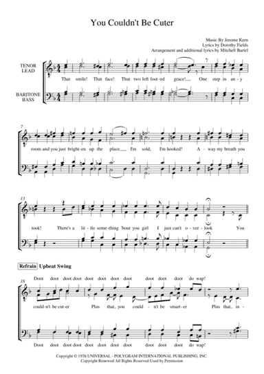 Choral Choir (TTBB) - Level 4 - Digital Download SKU: A0.1032176 Composed by Jerome Kern. Arranged by Mitchell Bartel. A Cappella,Barbershop,Jazz. Octavo. 6 pages. Mitchell Bartel #4763631. Published by Mitchell Bartel (A0.1032176). You Couldn't be Cuter by Jerome Kern and Dorothy Fields for Barbershop ensemble. This product was created by a member of ArrangeMe, Hal Leonard’s global self-publishing community of independent composers, arrangers, and songwriters. ArrangeMe allows for the publication of unique arrangements of both popular titles and original compositions from a wide variety of voices and backgrounds. About Digital Downloads Digital Downloads are downloadable sheet music files that can be viewed directly on your computer, tablet or mobile device. Once you download your digital sheet music, you can view and print it at home, school, or anywhere you want to make music, and you don’t have to be connected to the internet. Just purchase, download and play! PLEASE NOTE: Your Digital Download will have a watermark at the bottom of each page that will include your name, purchase date and number of copies purchased. You are only authorized to print the number of copies that you have purchased. You may not digitally distribute or print more copies than purchased for use (i.e., you may not print or digitally distribute individual copies to friends or students).