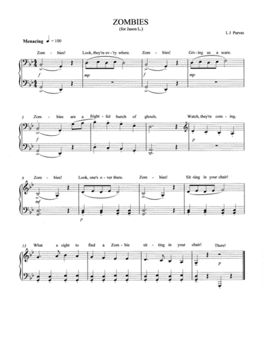 Easy Piano - Level 2 - Digital Download SKU: A0.1010741 Composed by L J Purves. Halloween. Score. 1 pages. L J Purves #2853469. Published by L J Purves (A0.1010741). ZOMBIES is a fun Halloween piece for Elementary pianists that explores abrupt dynamic changes, accent and staccato articulations and octave register changes.  Lyrics are included to inspire phrasing.  The piece is in G minor and suitable forlate elementary level students. This product was created by a member of ArrangeMe, Hal Leonard's global self-publishing community of independent composers, arrangers, and songwriters. ArrangeMe allows for the publication of unique arrangements of popular titles and original compositions from a variety of voices and backgrounds. The length, difficulty, and retail pricing are determined solely by the discretion of the person who arranged or composed it. About Digital Downloads Digital Downloads are downloadable sheet music files that can be viewed directly on your computer, tablet or mobile device. Once you download your digital sheet music, you can view and print it at home, school, or anywhere you want to make music, and you don’t have to be connected to the internet. Just purchase, download and play! PLEASE NOTE: Your Digital Download will have a watermark at the bottom of each page that will include your name, purchase date and number of copies purchased. You are only authorized to print the number of copies that you have purchased. You may not digitally distribute or print more copies than purchased for use (i.e., you may not print or digitally distribute individual copies to friends or students).